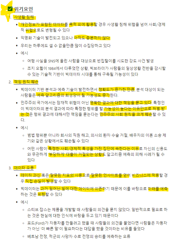 책임원칙훼손 - 마이러니티 리포트 영화 보면 이해 빠름 - 미래 예측할 수 있는 능력 가진 캐릭터들이 미래에 일으킬 범죄를 미리 범죄자를 체포하는 스토리 - 빅데이터 기반 예측기술 가지고 오판을 하면 안 된다.