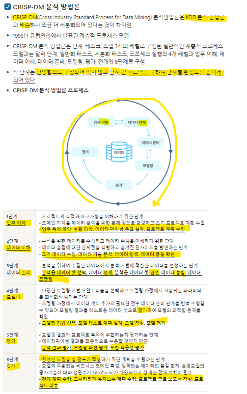 CRISP_DM 분석방법론은 KDD분석 방법론 (단방향) 과 달리 단방향으로 구성되어 있지 않고 단계 간 피드백 통해 단계별 완성도 높인다는 차이점 있음