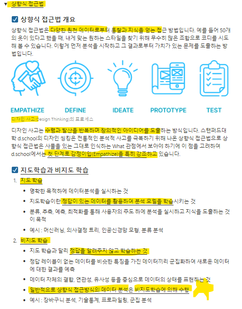 디자인 사고: 공갑 - 문제를 정의 -> 아이디어를 자유롭게 내기 (실현가능서 상관없이) -> 이 아이디어 바탕으로 프로토타입 시나리오 만들고 TEST 단계로 검증하는 넘기는 것.