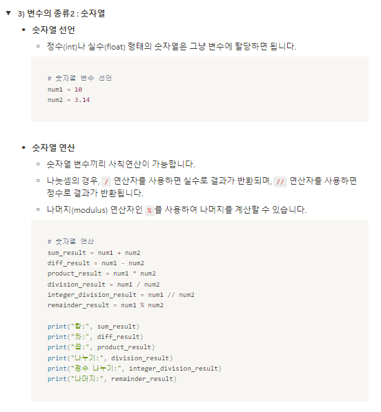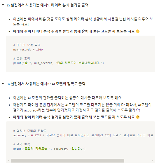 - 데이터 계산 : 데이터 분석에서 가장 중요한 과정이며 이를 수행하는데도 파이썬 문법이 필수적입니다. 다양한 통계적인 계산을 수행하기도 하며 직접 만든 수식을 적용하기도 하고 머신러닝이나 딥러닝을 함께 사용하기도 합니다