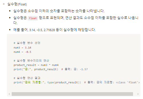 floats 실수 (유리수, 무리수, 정수 포함, 소수점으로 이루어진 숫자들, 딱 떨어지지 않는 숫자들)
