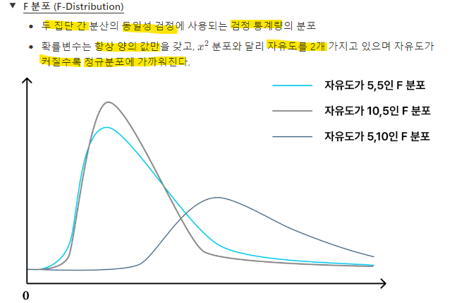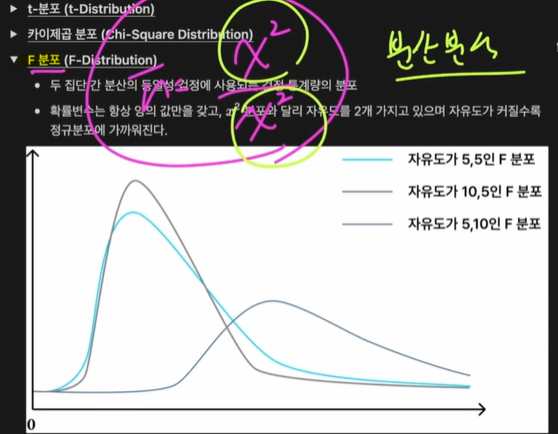 F분포: 카이스퀘어 분포들의 비율을 가지고 분포한 것. // 양수임